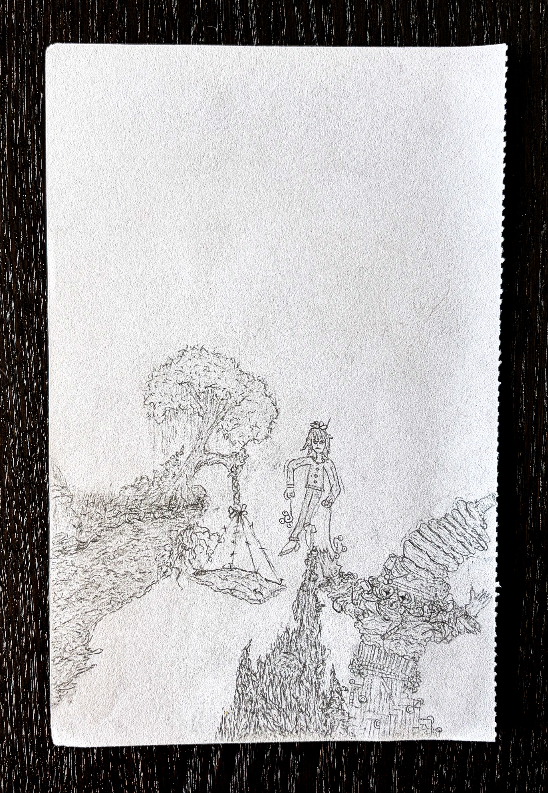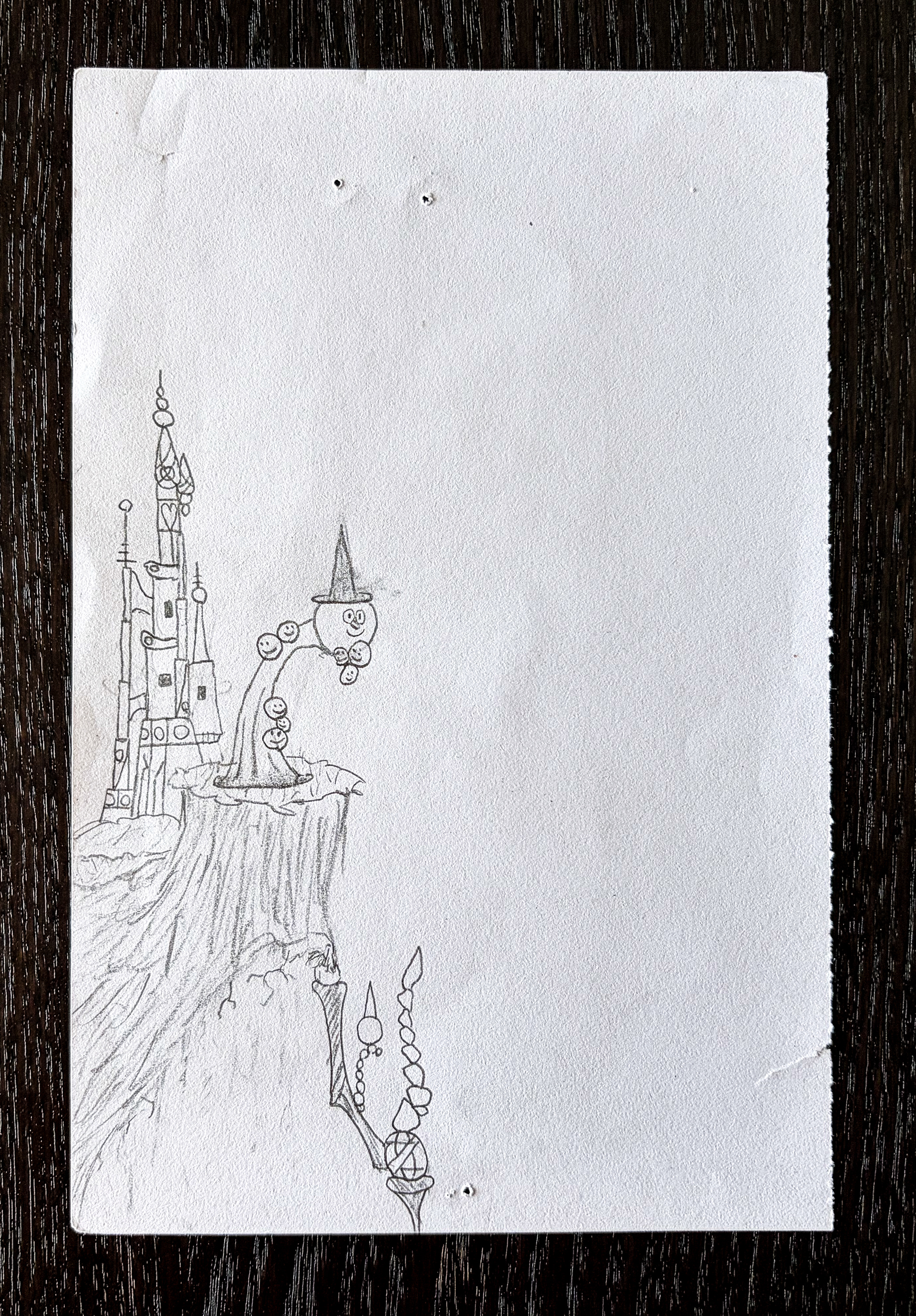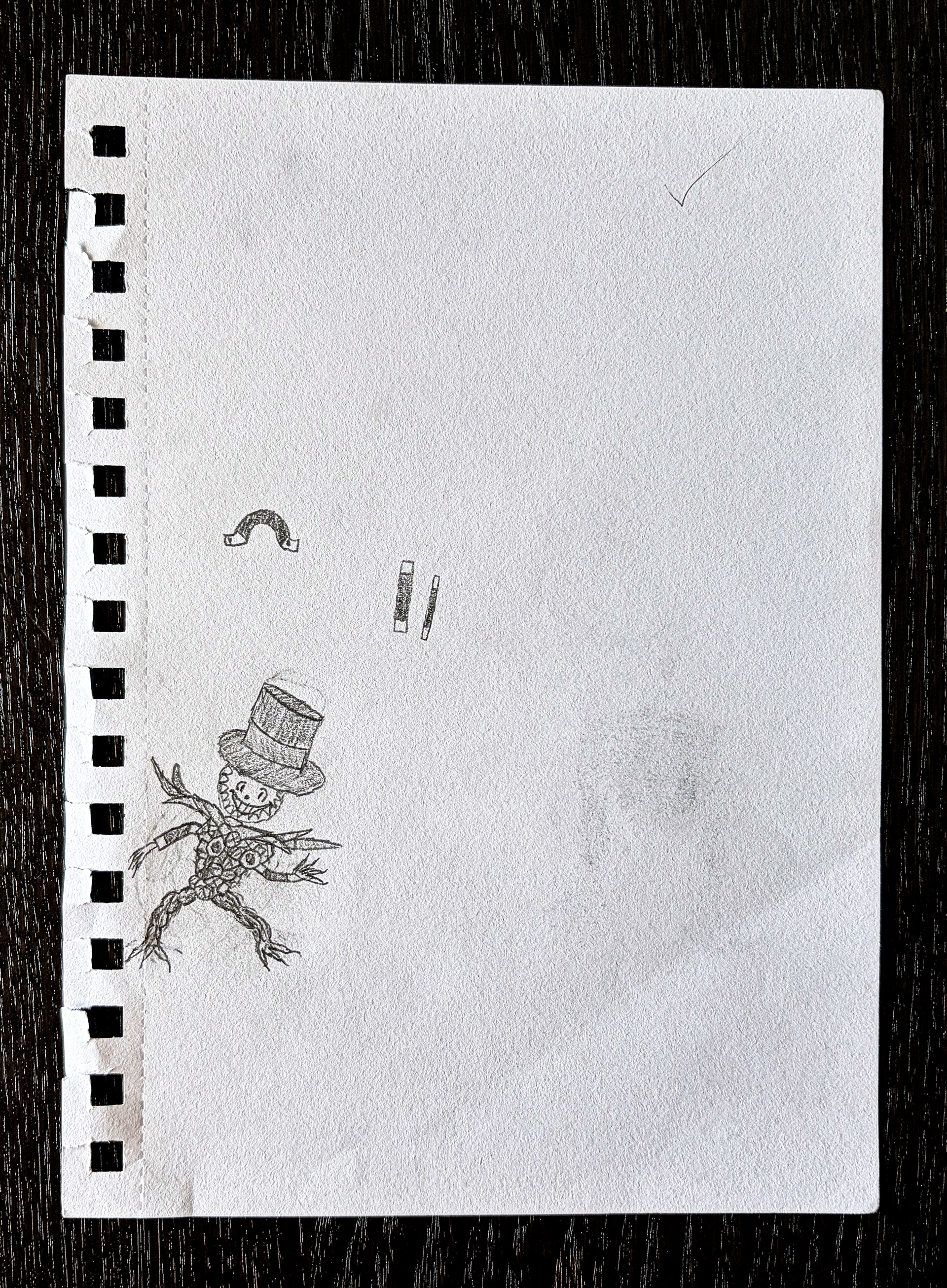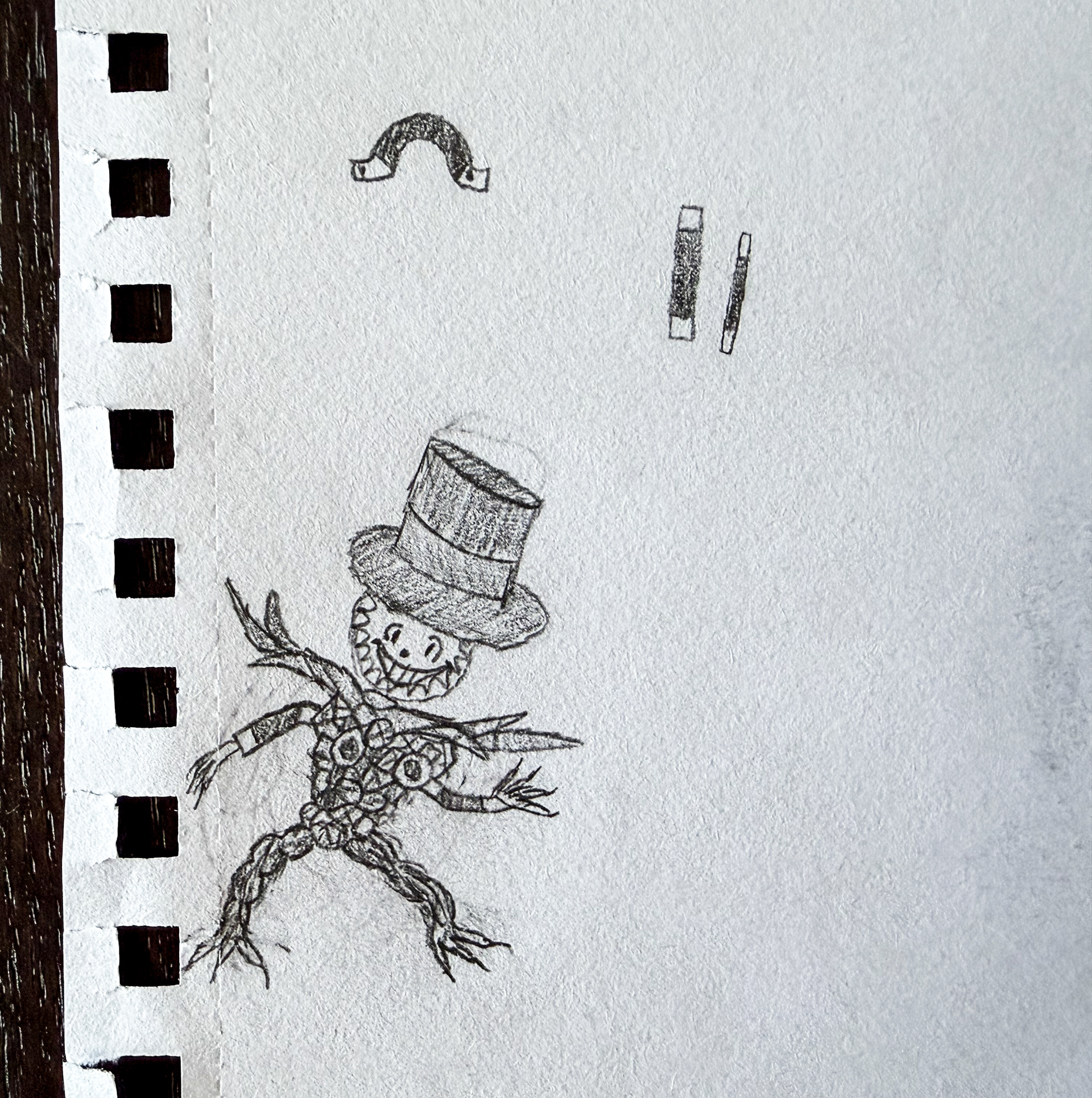 This sketch represents a mini monstrous figure wearing a magician hat and having sentient "magic wand arms". The smaller sketches show sentient magic wand and its function within the entity.