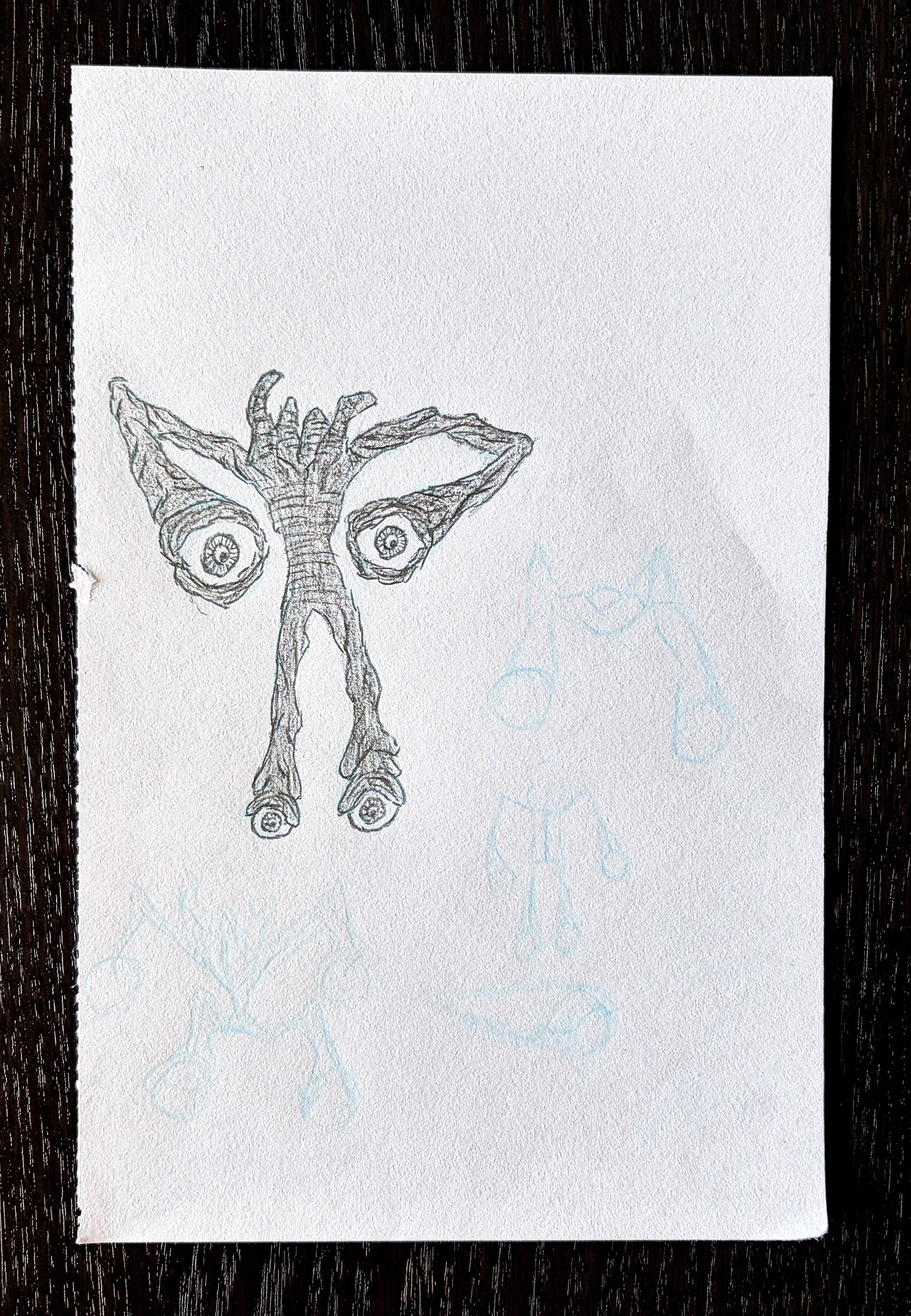 This character sketch represents an entity with large eyeballs as its feet and hands, with a crusty, shell-like body. Its actual head is represented by four mound-like formations.