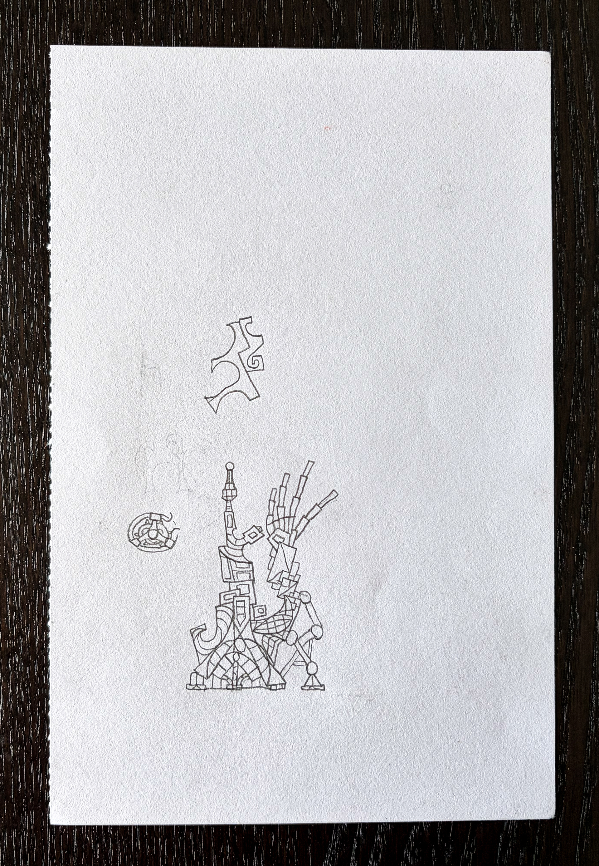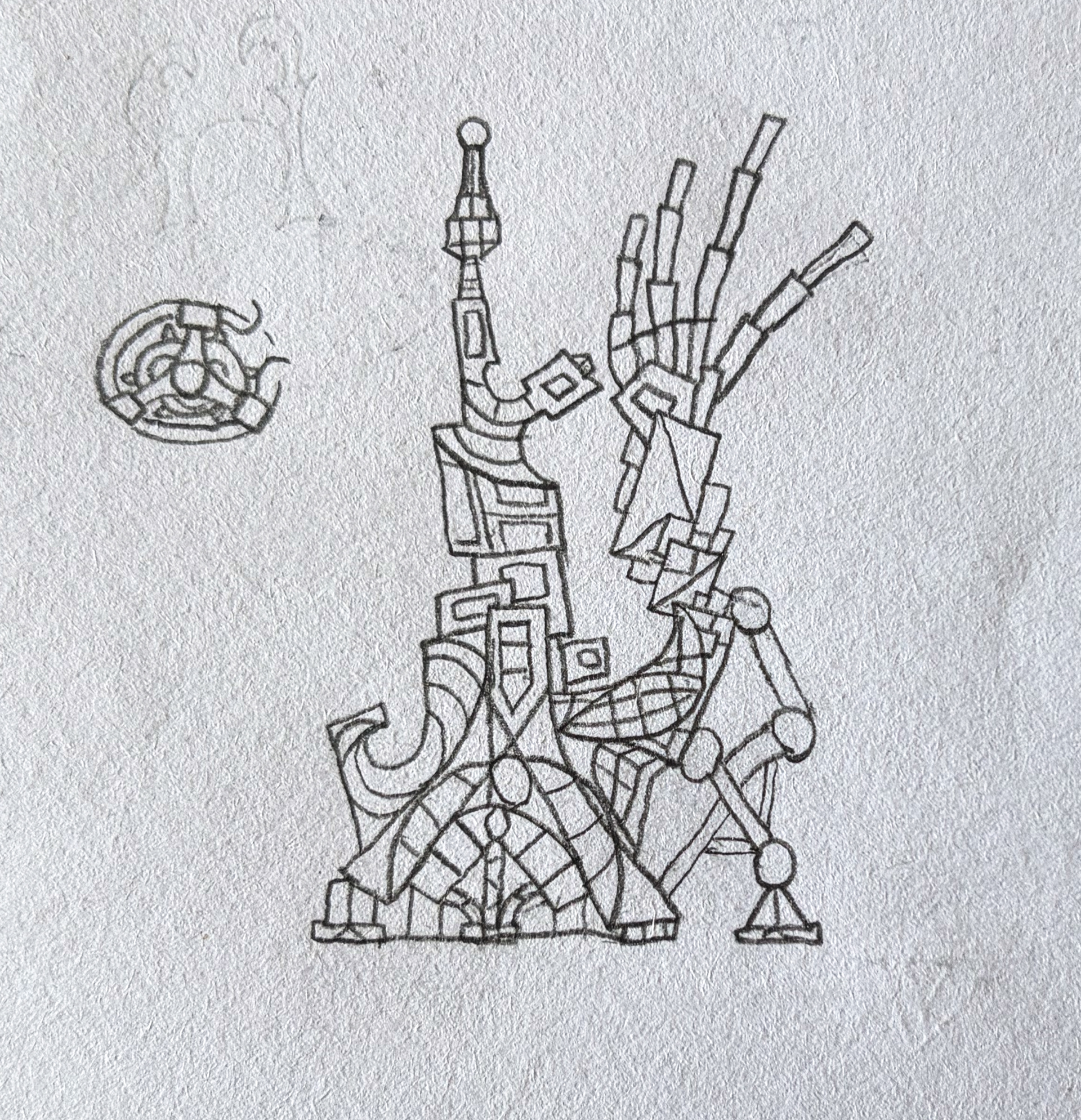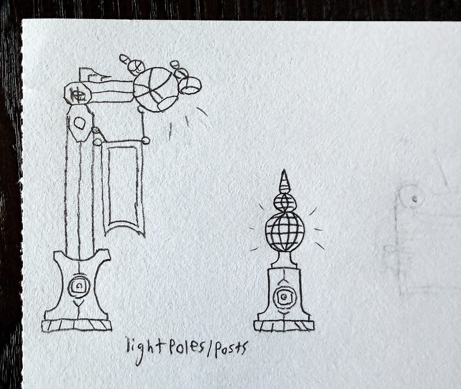 These thumbnail sketches represent designs for light poles/posts. These designs continue the subconscious-world theme, with a mysterious emblem representing a fictitious company.