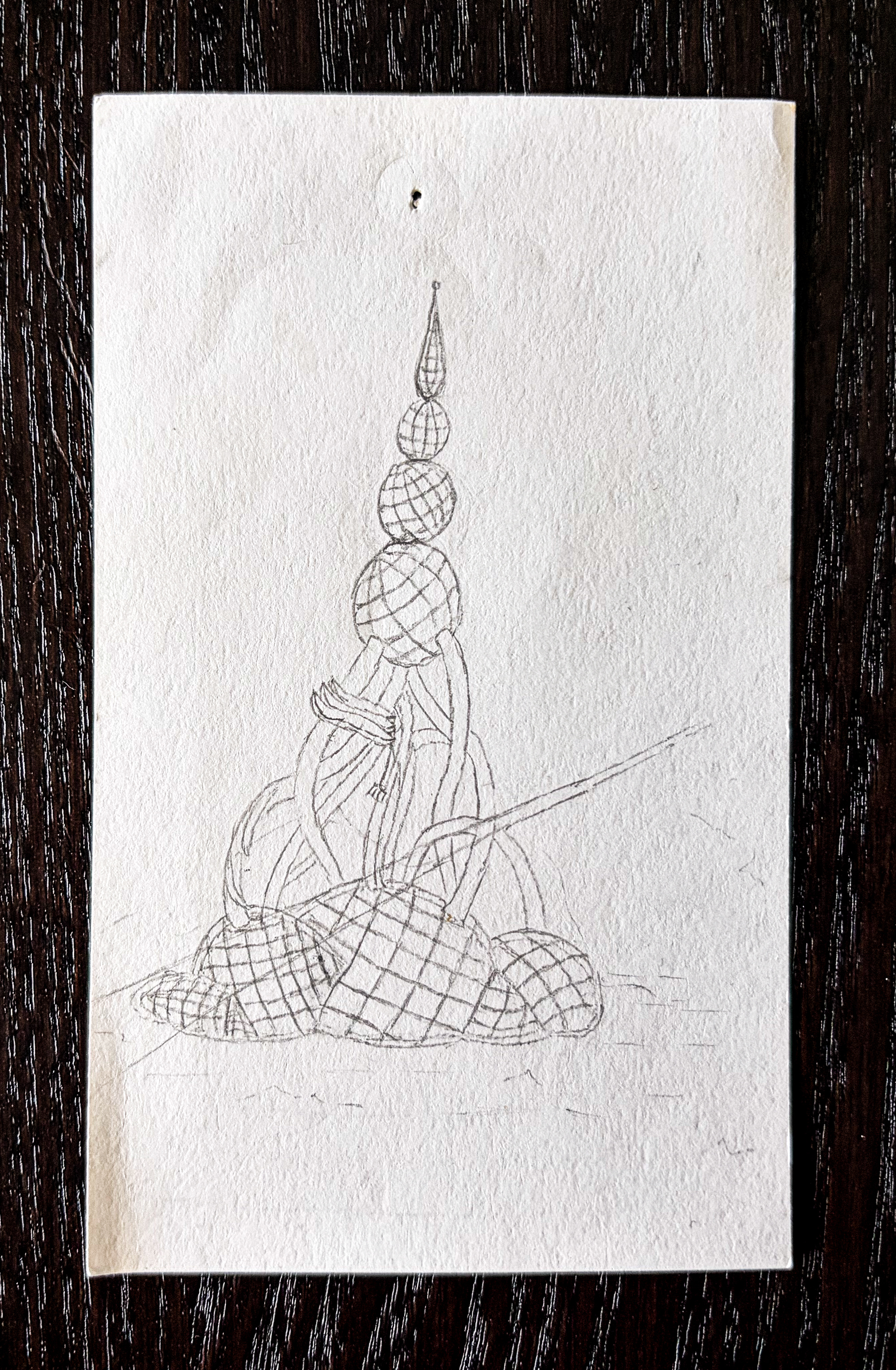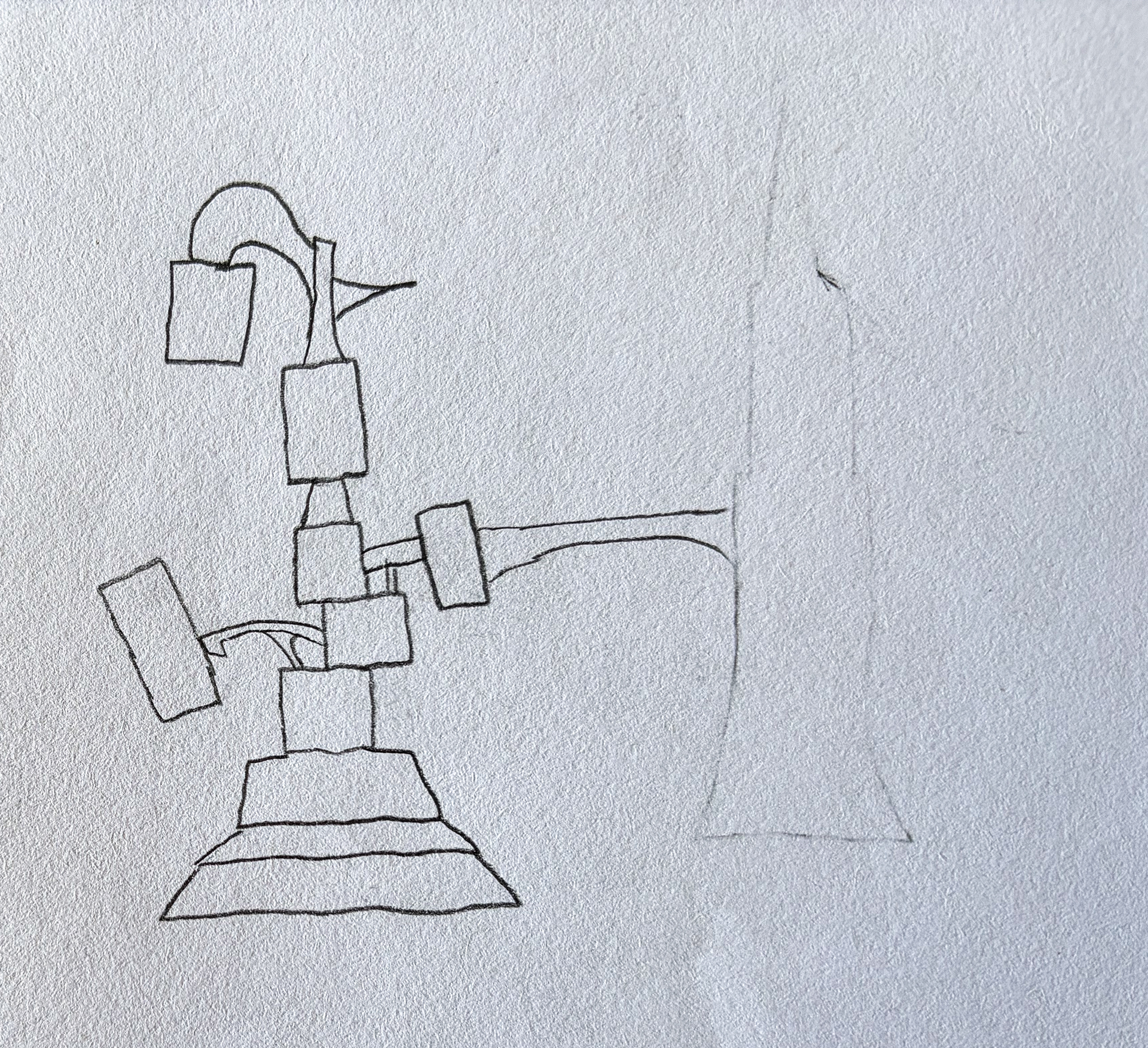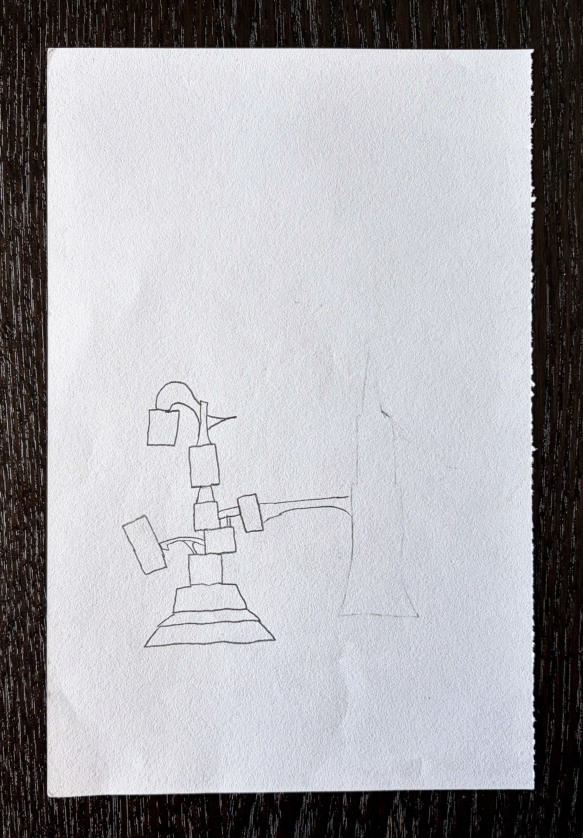 This simple sketch represents the concept of a uniquely designed skyscraper comprising of a tower of boxes, some boxes being satellites connected by bridges.