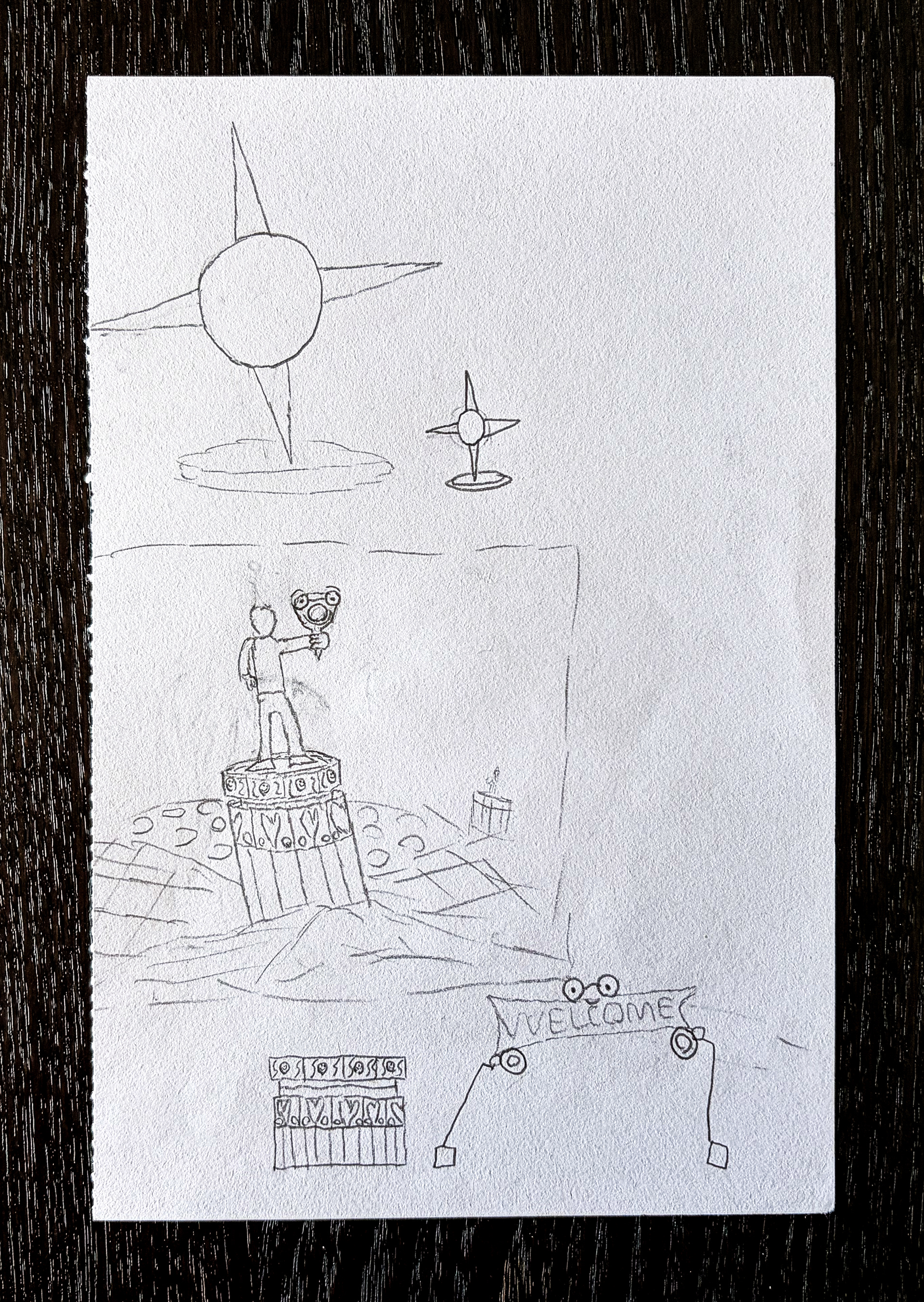 This sketch represents a concept for a fully physical interactive attraction representing the subconscious-like world theme, featuring Audio-Animatronics and special effects. Top: A simple sketch of a freestanding compass portal Middle: A thumbnail sketch showing the major scene for the "challenge", featuring one of the enemies holding his weapon. Bottom: The pedestal the enemy stands on and a strange "welcome sign" entity.