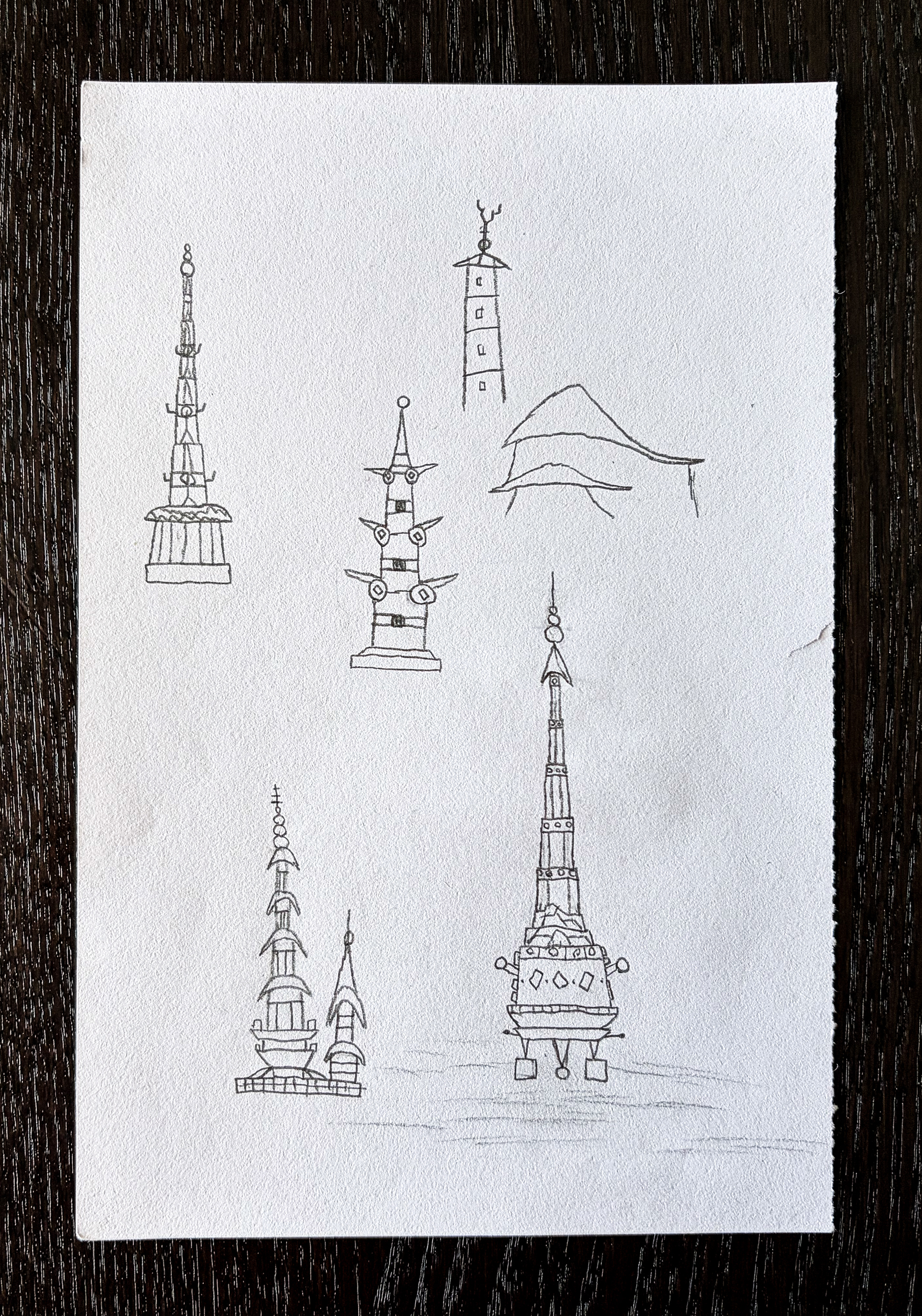 These set of thumbnail sketches represent different concepts for unique skyscrapers/towers. This collection of towers takes inspiration from East Asian architectural elements, especially pagoda elements such as the shrinking boxes.